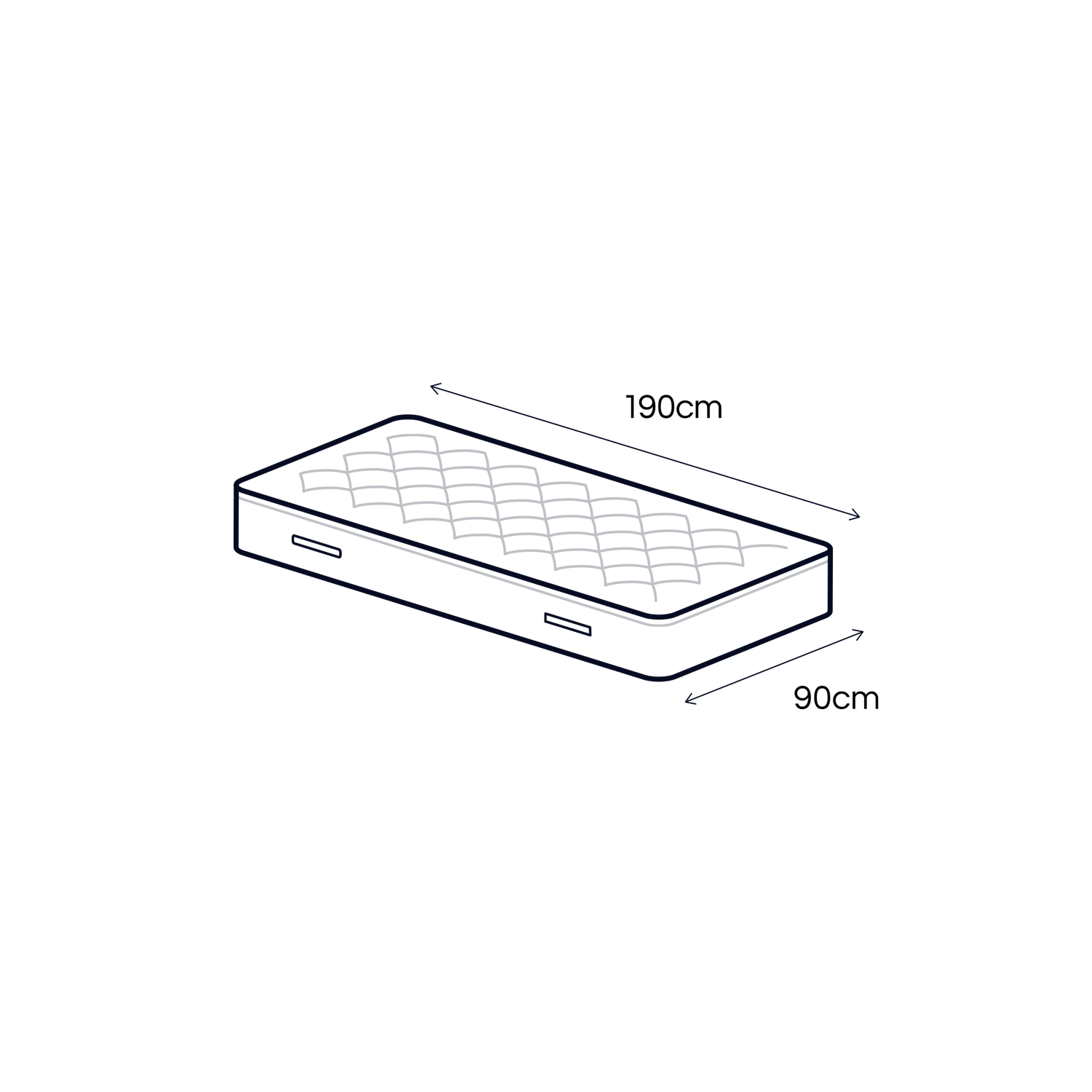 Nuestras camas individuales y colchones miden 90 cm de ancho y 190 cm de largo (3'0" de ancho y 6'3" de largo). Adecuada para una sola cama, esta opción es perfecta para niños en crecimiento o invitados. El tamaño más pequeño es ideal para aprovechar al máximo el espacio de su habitación.